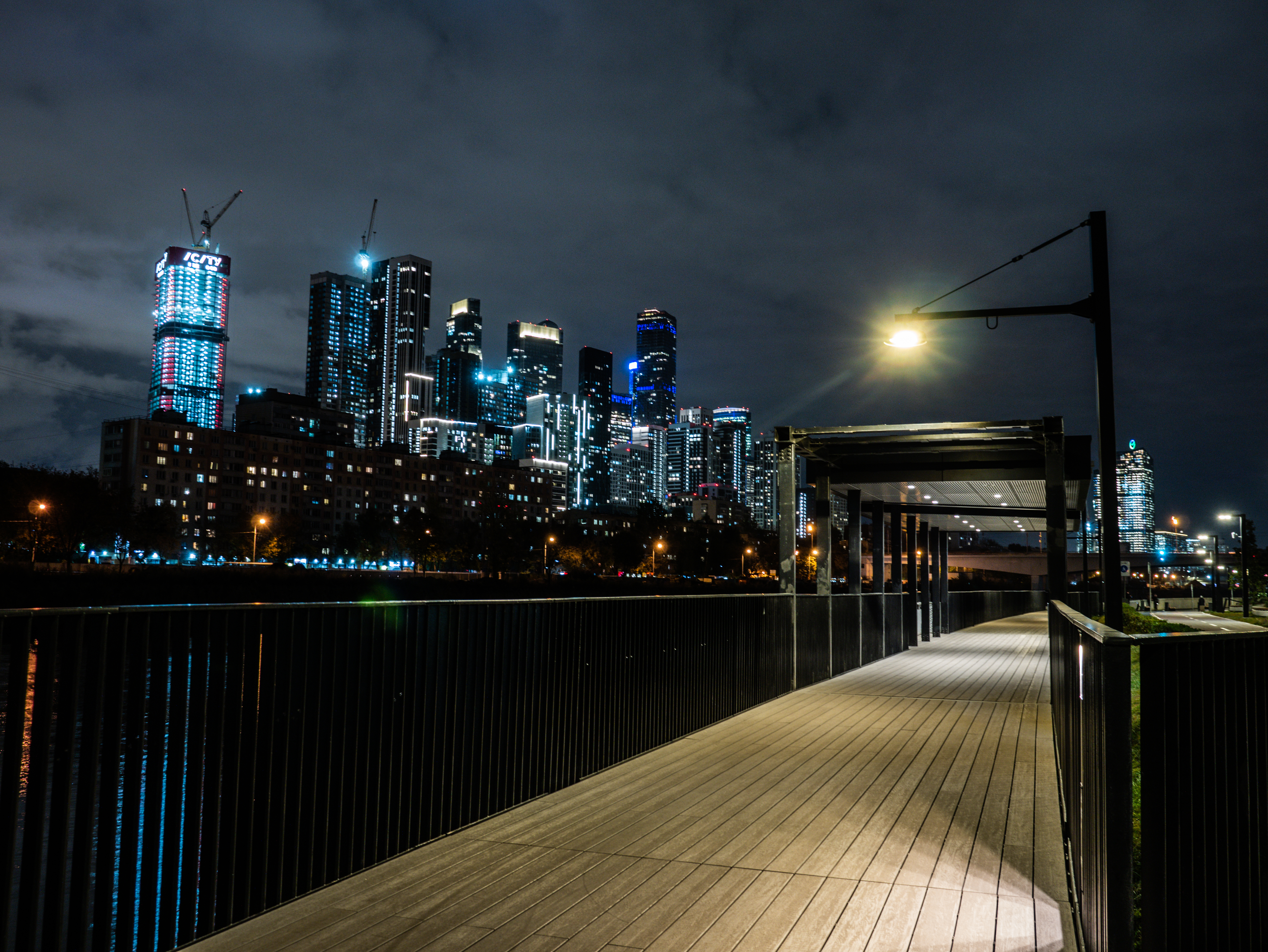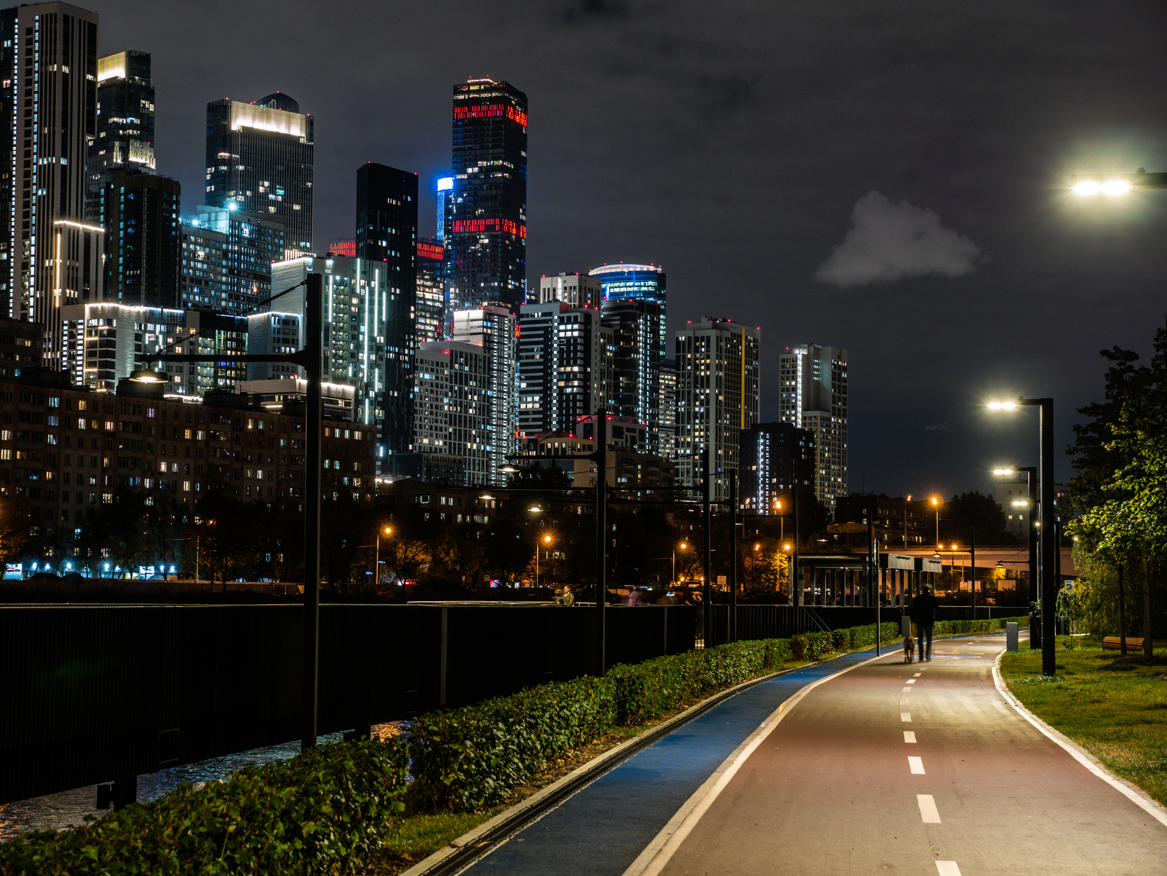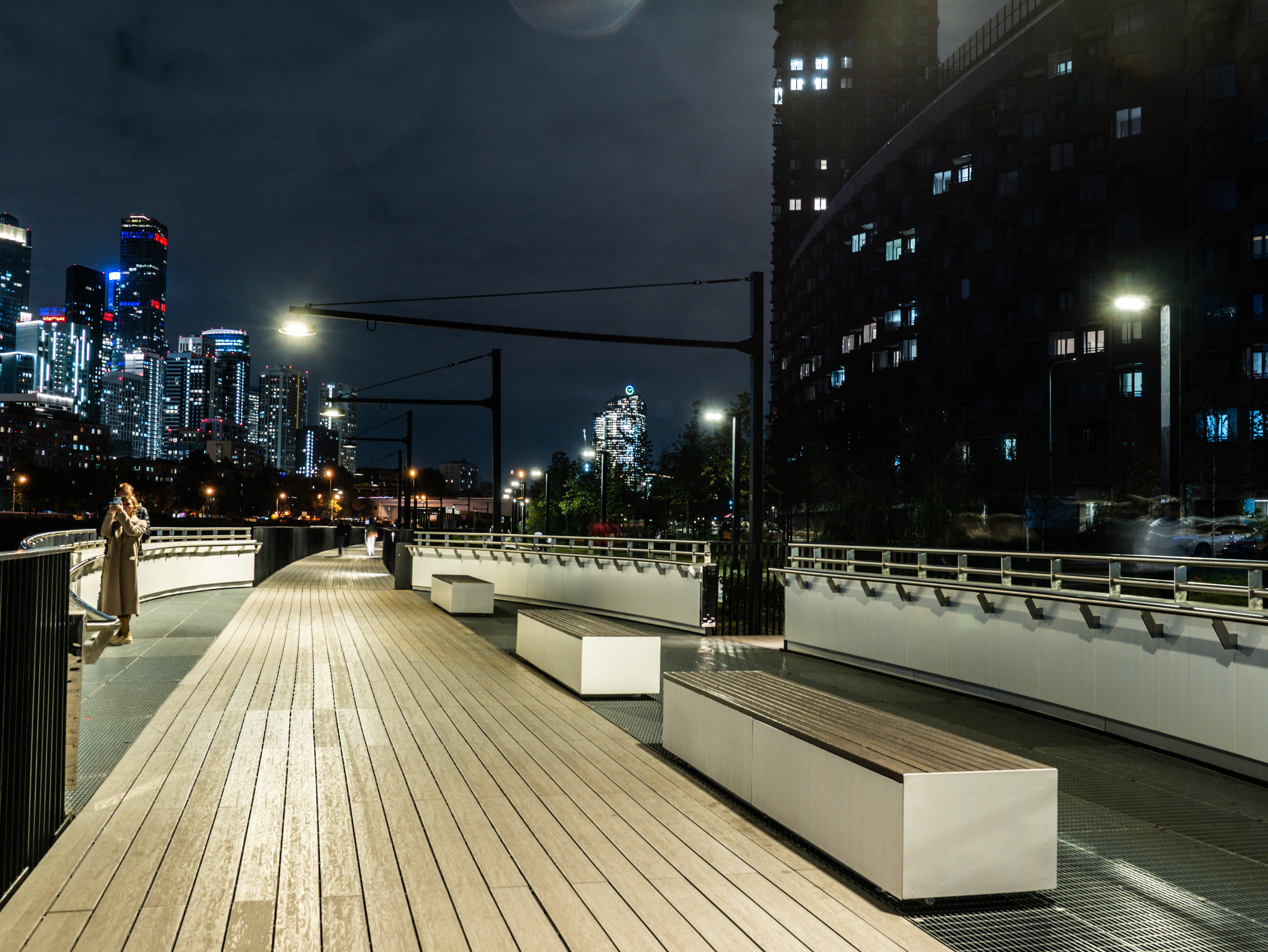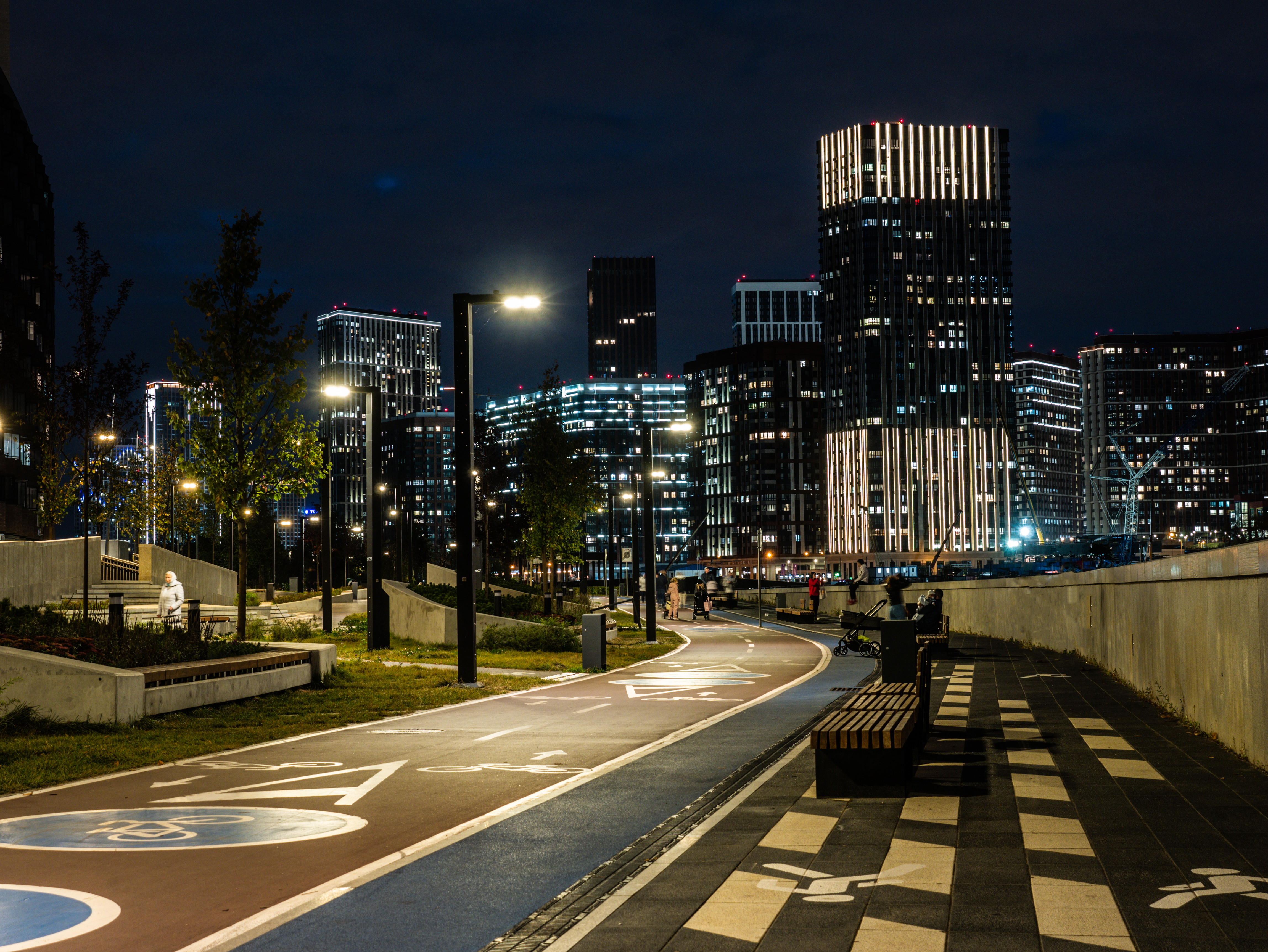 Городская набережная полностью пешеходная, здесь предусмотрена смотровая зона с видом на городские пейзажи и «Москву-Сити». Территория променада зонирована с учетом активного и тихого вида отдыха, проложена сеть велодорожек.
